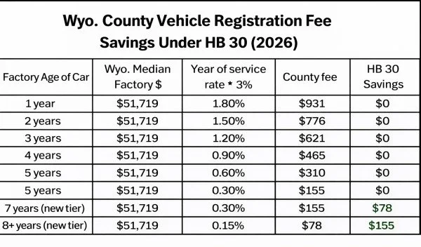 HB 30 (2026) scores positively on 3 of 6 considered Compass Points, leading Wyoming Liberty Group to urge caution on this legislation, while recognizing the positive aspects of the bill. This bill revises how Wyoming counties calculate vehicle registration fees for older vehicles by changing the valuation formula used after a vehicle's fifth year of service. It removes the existing provision that sets sixth-year vehicles at 3% of 15% of the factory price plus special equipment. In its place, the bill establishes new tiers: vehicles in their seventh year will be assessed at 3% of 10% of the factory price plus special equipment, while vehicles in their eighth year and beyond will be assessed at 3% of 5% of that value. By lowering the percentage applied as vehicles age, the bill is intended to reduce registration costs for owners of older vehicles. The changes would take effect on July 1, 2026.